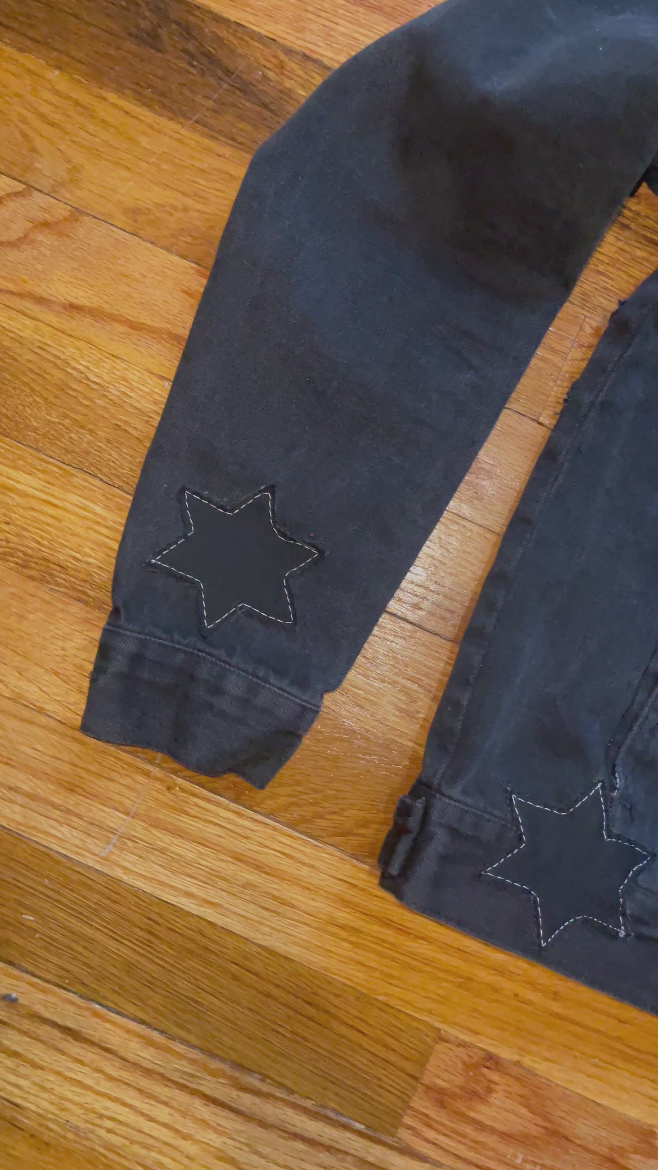 Stand out in bold contrast with this statement-making denim jacket. Designed with a unique half-and-half wash, one side features deep black denim while the other showcases a light blue fade. This represents the unifications of Northern and Southern Kingdoms of Israel being brought together as one nation. The jacket is detailed with appliqué Lily patches in mixed washes, bringing texture and dimension to the piece. Hand-stitched accents and graffiti-inspired embroidery add an urban edge, making it perfect for streetwear styling. Crafted for comfort and individuality, this jacket bridges heritage and modern fashion for a look that’s truly one of a kind.